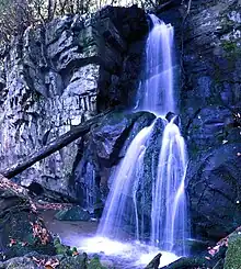 The source of Roaring Fork is located nearly 5,000 feet (1,500 m) up along the northern slopes of Mount Le Conte, where several small springs converge. The highest of these springs, known as Basin Spring, provides the water source for LeConte Lodge.[2] From its source, Roaring Fork drops 2,500 feet (760 m) over just two miles (3.2 km), spilling over Grotto Falls and absorbing Surry Creek before steadying in a narrow valley between Mount Winnesoka and Piney Mountain. The mouth of Roaring Fork is located at the northern end of Gatlinburg, where it empties into the West Fork of the Little Pigeon River.