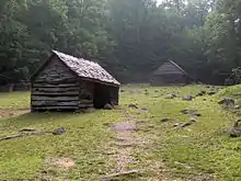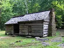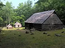 The Bales cabin was a double cabin with a passageway known as a "dog trot" in between. Dog-trot cabins, which are fairly common throughout the southeastern U.S., typically involve two adjacent cabins with roughly 10 feet (3.0 m) in between, but with one continuous roof. The space between the two halves was relatively cool in summer and warm in winter, making it attractive to dogs. Both halves of the cabin have their own chimney.[11] With the exception of a back porch, the cabin remains largely as it was when the Bales family lived in here in the early 1900s.[10] Along with the cabin, Bales' corn crib, hog pen, and barn are still standing today, just a few yards from the cabin. A rock wall and paling fence behind the cabin are representative of the two major barriers used in the Northern Smokies in the late 19th and early 20th centuries.