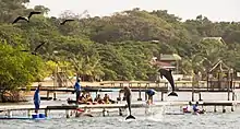 It is part of Anthony's Key Resort, a tourist complex belonging to the Galindo family, that offers accommodations in bungalows, kayaking, spas, excursions and various interactions with captive dolphins such as swimming.[2] It was founded in 1989 with the purpose of investigating coral reefs and aquatic life in general in the coastal zones of Honduras and the surrounding areas.[3] The institute also has a small marine museum and the "Dolphin Discovery Camp" for the study of dolphin behavior (two when it started) and in 2017 the population of the dolphinarium was twenty-six cetaceans.[4] Of these, seven were captured wild, one was rescued and eighteen were born there.[4] They are spread over two coastal enclosures, one on the small island of Bailey's Key (Dolphin Encounter) and the other on the main island of Roatán (Dolphin Presentation).