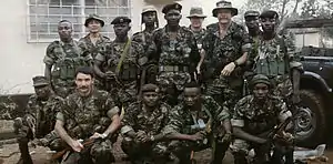 Robert C. MacKenzie (standing, wings on hat) with some of the Sierra Leone Commando Unit he was training with the Gurkha Security Guards. Andy Myers is second from left, kneeling.