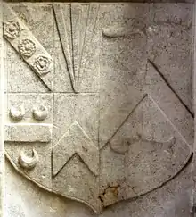 His large monument, with strapwork decoration, survives against the south wall of the chancel of All Saints Church, Clovelly. Along the full length of the cornice is inscribed in gilt capitals: Robertus Carius, Armiger, obiit An(no) Do(mini) 1586[8] ("Robert Cary, Esquire, died in the year of Our Lord 1586"). On the base of the north side are shown two relief sculpted heraldic escutcheons, showing Cary impaling Chequy argent and sable, a fess vairy argent and gules[9] (Fulkeram, for his father) and Cary impaling Sable, three swords pilewise points in base proper pomels and hilts or (Poulett, for his grandfather). On the base of the west side is a similar escutcheon showing his own arms of Cary (of four quarters, 1st: Cary; 2nd: Or, three piles in point azure (Bryan);[10] 3rd: Gules, a fess between three crescents argent (Holleway);[11] 4th: A chevron (unknown, possibly Hankford: Sable, a chevron barry nebuly argent and gules[12]) impaling Gules, a chevron or between three millets hauriant argent (Milliton, canting arms, a "millet" in heraldry being a type of fish, possibly a mullet)[4])