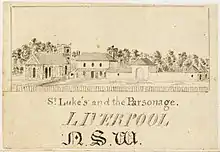 Cartwright remained in Windsor until December 1819, being appointed in that year, largely through the influence of the Governor, resident chaplain at Liverpool. He was the first incumbent of St. Luke's Church, Liverpool, where he remained until 1836.[3] Besides his pastoral work he was appointed superintendent of the Orphan School, as well as an establishment for the instruction of the children of the Aborigines.[4] In 1836, there being a vacancy in St. James's, Sydney, Cartwright was removed to that historic church, succeeding Richard Hill as rector, and remained there until 1838.[3]
