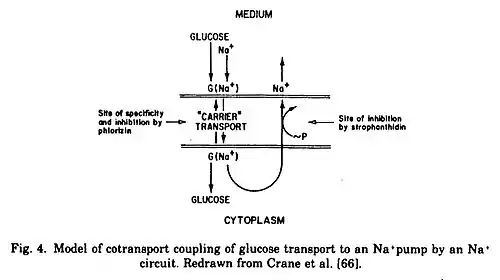- 1 2 Robert K. Crane, D. Miller and I. Bihler. "The restrictions on possible mechanisms of intestinal transport of sugars". In: Membrane Transport and Metabolism. Proceedings of a Symposium held in Prague, August 22–27, 1960. Edited by A. Kleinzeller and A. Kotyk. Czech Academy of Sciences, Prague, 1961, pp. 439–449. Model of cotransport on page 448.