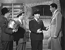 Robert Kellard (far right) fires The Three Stooges from their job in 1946's Rhythm and Weep