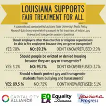 A 2017 Public Religion Research Institute (PRRI) poll found that 48% of Louisianans supported same-sex marriage, while 44% were opposed and 8% were undecided. Additionally, 61% supported an anti-discrimination law covering sexual orientation and gender identity. 29% were against. The PRRI also found that 54% were against allowing public businesses to refuse to serve LGBT people due to religious beliefs, while 37% supported such religiously-based refusals.[57]