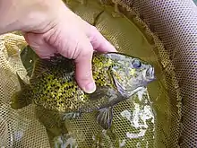 Rock bass are sexually mature at about 2 to 3 years of age. Rock bass are polygynandrous, in which both females and males have multiple mates during the breeding season. Spawning occurs from April to early June in warm waters ranging from 12 to 15 degrees Celsius, with females laying from 2,000 to 11,000 eggs.[6] Like other members of the sunfish family, the male will dig a nest near the lake shallows, and will aggressively guard it. A spawning area may be heavily used, with several other rock bass nests very close together.[8] As a result, males can become quite aggressive as they attempt to defend territory and attract and hold females. Rock bass lack courtship displays, so the female enters the nest and joins the male in his circular behavior. Both the female and male simultaneously release their sperm and eggs into the nest.[7] The male guards and fans the eggs, and later raises the young for a short time.[3] Rock bass are known to grow quickly.