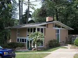 The Rock Creek Woods Historic District is a national historic district located north of Kensington, Montgomery County, Maryland (although the postal address is Silver Spring). This suburban development, consisting of 74 Contemporary houses, is nestled in a wooded valley between two creeks near Connecticut Avenue (MD 185). These houses were designed by Charles Goodman and built between 1958 and 1961 by Herschel and Marvin Blumberg, developers of New Town Center in nearby Hyattsville, Maryland. The original layout, including roads, lot configurations, and sidewalks, remains unaltered. During the 1960s, the neighborhood was home to a significant Jewish population and many people in the neighborhood were active in liberal causes, particularly the peace movement. [2]