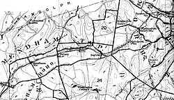 The road extends from White House to Watnong, a distance of 24½ miles with 2 miles of sidings. It is a very crooked line with heavy grades and curves, built upon the same plan as a trolley, up and down, without regard to grade or line. [The ruling grade was 4% near Peapack, New Jersey.] The track is laid with mostly 50 and 56 pound [per yard; 25 and 28 kg/m] rail, badly worn [at the time of the report, 80-to-90-pound-per-yard (40 to 45 kg/m) rail was considered to be standard]. The road is ballasted for about 4 miles with cinders in small quantities, the remainder is mud, and for miles ties lie on top of the ground with no ballast. Cuts and fills are light. Two mixed trains are run each day on which passengers are carried. The road's equipment includes one old coach and an engine which has been furnished by the Central Railroad of New Jersey for 6 dollars a day. The superintendent of the road is doing all he can to maintain the road with the means at his command.