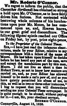 There was a long-running dispute between O'Connor and former colleague Joseph Henry Moore, which was played out in a series of letters in the Hobart Town Courier and The Colonial Times. It later came to court when Moore sued for libel. O'Connor accused Moore of having obtained land by corrupt means. After O'Connor wrote a letter cancelling his subscription to the paper, The Colonial Times satirically referred to him as "Don Roderic", with reference to his claim to descended from the kings of Ireland, and ridiculed the "scurrility and abuse" to which he resorted.[10] In the end Moore won damages from the court of 40 shillings on two counts. However the jury added that "Mr. Moore had improper and illegal possession" of the land, but had not obtained it by "dishonourable means".[11][12]