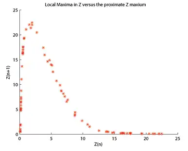 The Lorenz map is the relation between successive maxima of a coordinate in a trajectory. Consider a trajectory on the attractor, and let be the n-th maximum of its x-coordinate. Then - scatterplot is almost a curve, meaning that knowing one can almost exactly predict .[8]