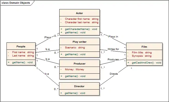 A simple application of the role class model in a real example is in the 7th art (see Figure 3), the cinematography. This art involves a creation (the Film) and people to create it. Each person has a different role in the film, they could be actors and play characters, they could be director or scenarist, etc. A person is not limited to one role in a film, they can be both actors and directors and even more. For example, the film Scoop (2006) has been directed by Woody Allen, he is also the scenarist and he plays the role of Sid Waterman.