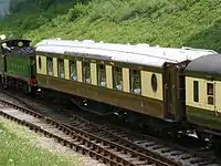 | LSWR | 1520 | Brake Third | Operational. Built in 1910. The carriage was relaunched into traffic in April 2010 following major rebuild from departmental use. The carriage has been finished in LSWR livery, and as such only sees limited use as it does not match other carriages of a similar vintage. | ![]() |