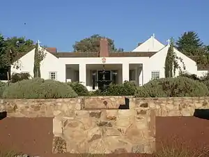 St Christopher's was built as the first parish church in Canberra by the first priest, Father Patrick Haydon, although the beginnings of Catholic life in the district go back to 1862 when the Diocese of Goulburn was erected.[3] The parish was originally part of St Gregory's Parish, Queanbeyan, until 1912. Following the erection of the Diocese of Wagga Wagga in 1918, the parish was transferred to the Diocese of Goulburn.[4] A foundation stone was laid by Archbishop Kelly in 1927 for a church and school. The following year St Christopher's became an independent parish with the first classes taught in the adjacent school, and the open day attended by the Prime Minister, Bruce. In 1930 a large cathedral was proposed for the site behind Regatta Point, but economic circumstances and World War II made this impractical.[5] A foundation stone for the cathedral was laid in 1938 by Archbishop of Sydney Gilroy in a ceremony which included Joseph Lyons and James Scullin. The choice of St Christopher as patron saint was selected on the basis that Canberra would be a place to which many travellers would come. In the presence of Robert Menzies, the Apostolic Delegate, Archbishop Panico, opened the parish church in 1939.[3]