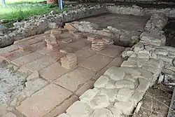 During this phase (late 1st or early 2nd century AD), the villa was greatly extended with the help of the architect Mustius[13] firstly with an impressive façade doubling the length of the villa, faced with a portico featuring symmetrical projecting avant-corps at its corners and a small temple in the centre.[14] Behind the portico a large square was created which was flanked to the east by a pair of two-storey farm buildings.