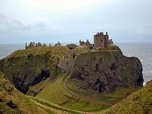 Following his introduction to chivalry, Fergus makes his way to Liddel Castle, where he first encounters Galiene, the niece of the castellan. She declares her love for him, but he only promises to return after he has fulfilled his quest. Having vanquished the Black Knight, Fergus returns, only to find that Galiene has disappeared. At this point, the magic of love hits Fergus. He searches for her in vain for a year, until he meets a dwarf who tells him that he will retrieve his lost love if he can obtain a shield from a hag in Dunnottar Castle. With renewed hope, Fergus makes his way to Queensferry, to cross from "England" into "Scotland"; however, he gets into a dispute with the boatmen, dispatches them all, and is forced to sail himself over. Upon reaching Dunnotar, Fergus slays the guardian of the shield, and returns to Lothian. It is then that he is told that Galiene is the new ruler of Lothian, but is besieged in Roxburgh by a neighbouring king. On the way to Roxburgh, he is waylaid at Melrose by the husband of the hag-dragon he dispatched at Dunnottar. Emerging victorious, Fergus takes up residence in Melrose, and from there wreaks havoc on the army. He defeats some of its greatest knights, but this is not enough to lift the siege.