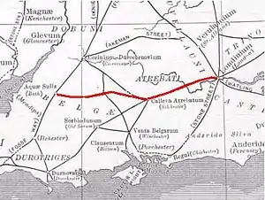 The Roman road from Silchester to Bath connected Calleva Atrebatum (Silchester) with Aquae Sulis (Bath) via Spinae (Speen), Cunetio (near Marlborough) and Verlucio (near Sandy Lane).[1] The road was a significant route for east–west travel and military logistics in south-east England during the 1st to 5th centuries.