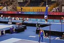 Gymnast Andrei Muntean performing on the horizontal bar during the artistic gymnastics competition on 16 August 2010 at Bishan Sports Hall, Singapore