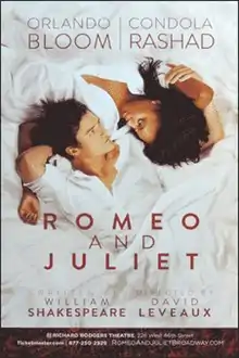 It was the first Broadway production of the play Romeo and Juliet since 1977.[1] The play ran on Broadway at Richard Rodgers Theatre from September 19 to December 8, 2013, for 93 regular performances after 27 previews starting on August 24 with Orlando Bloom and Condola Rashād in the starring roles.[2] On November 27, two performances of the production were filmed with nine cameras in high definition, and these performances were scheduled to be released in 2000 theatres on February 13 for the Valentine's Day week in 2014 in the United States.[3] The United Kingdom theatrical release date was April 1.[4]