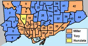 - ↑ Bruce DeMara, "Election primer: Wards and issues", Toronto Star, 8 November 2003, B1.