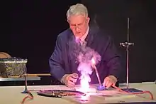 ![]() Reverend Ron Lancaster giving a fireworks demonstration at Kimbolton School. | |