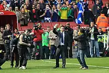 In the second leg of Real Madrid's Champions League quarter-final, Ronaldo scored a hat-trick against Manchester United at Old Trafford, knocking the English team out of the competition.[66] Completing his hat-trick with a swerving strike from 30 yards, Ronaldo was substituted off after 67 minutes, and was given a standing ovation from both sets of fans.[67][66] Reflecting on the ovation given to him from the oppositions' fans, Ronaldo stated that "it remains a very beautiful, very special moment".[68] Manchester United defender Wes Brown commented, "He was just unstoppable. A young Ronaldo [before a series of injuries] would have been even more dangerous, but it shows how good a player he was. Whenever he wanted to turn it on he could, on any stage, in any stadium".[67] Ronaldo scored in a 2–1 home win over Juventus in the first leg of the Champions League semi-finals, but injury crucially kept him out of most of the second leg defeat where Real were eliminated.[69]