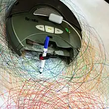 Roombas before the seventh-generation models do not map out the rooms they are cleaning. Instead, iRobot developed a technology called iAdapt Responsive Cleaning Technology.[24] This relies on a few simple algorithms, such as spiraling, room crossing, wall following, and random walk angle changing after bumping into an object or wall. This design is based on MIT researcher and iRobot CTO Rodney Brooks's philosophy that robots should be like insects, equipped with simple control mechanisms tuned to their environments. The result is that although Roombas are effective at cleaning rooms, they take several times longer to do the job than a human would. The Roomba may cover some areas many times, other areas only once or twice, and may miss some areas. However, the random algorithm has been shown to effectively cover rooms of various sizes and configurations, particularly when used repeatedly for maintenance cleaning. (Some users have used long-exposure photography or compositing to create images showing Roombas' coverage of the floor,[25] and have even attached light sources to Roombas to create art using light painting.[26][27] Some have also noted that doubts about the effectiveness of the random algorithms have been assuaged by multiple reports of Roombas rolling over dog feces and spreading it through the room, which rather unpleasantly illustrate how well the Roomba can cover the floor's area.[28][29]) Roombas have become a common example of how randomized algorithms can probabilistically succeed even though they cannot absolutely guarantee success on any single run or even after many repeated runs. Compared to competing products available when Roombas were first introduced such as the Electrolux Trilobite, the effectiveness of Roombas' random navigation was on par with (or even more effective than) robotic mapping technology available at the time, and being cheaper to develop and produce, could be offered at a significantly lower price.[30]