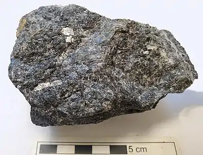 The Roosevelt Gabbros formation is differentiated from the Glen Mountain Layered Complex by the abundant presence of biotite and the inclusion of pink, brown, and green amphiboles. It is also differentiated from the Glen Mountain Layered Complex by the structures it forms, with the Roosevelt Gabbros forming irregular blobby dikes and sills which intrude the older Glen Mountain Layered Complex.[6] It is almost entirely gabbro, with the exception of where the younger Mount Scott Granite contacts the Roosevelt Gabbros. At these contacts more intermediate to felsic rocks such as quartz gabbro and granodiorite are found. This less mafic material is considered to be a hybrid unit between the two intrusions.[6]
