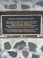 • The front of the monument facing Route 1 has a plaque that reads: "Dedicated to the men of Middlesex County who donated their labors to develop this park in exchange for the benefits of relief received. - Emergency Relief Administration (ERA), Lewis Compton, Director."
