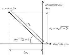 Effect of pole location on a second order system's natural frequency and damping ratio. This pole's complex conjugate (which necessarily exists since this pole has a nonzero imaginary component) is not shown.