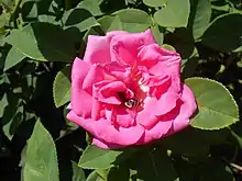 'Zephirine Drouhin' is a tall, climbing Bourbon rose, 10 to 15 ft (3.0–4.6 m) in height, with a 5 to 8 ft (1.5–2.4 m) spread. It has a semi-double (17–25 petals) bloom form, and is carried singly or in small clusters on short stems. Bloom size is 4 to 5 in (100 to 130 mm). Flower colour ranges from cherry-pink to a deep-rose pink. 'Zephirine Drouhin' is known for being one of the first and last roses to bloom, flowering abundantly and continually from June to the autumn. Flowers are very fragrant with a strong damask scent.. It can be grown as a shrub, climber or pillar rose. 'Zephirine Drouhin' is known for being completely thornless. The plant is prone to blackspot, mildew and rust.[1][2]