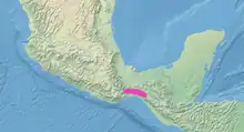 The rose-bellied bunting's core range is a narrow strip along the Pacific slope of the Isthmus of Tehuantepec in eastern Oaxaca and western Chiapas. There is one additional record further east in Chiapas, in El Triunfo Biosphere Reserve. It inhabits arid to semiarid thorn forest, moister gallery forest, and swamp forest. In elevation it ranges from 180 to 800 m (590 to 2,620 ft).[3]
