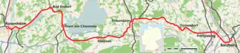 The next station is Traunstein, where several lines branch off: the line to Ruhpolding, the line to Traunreut and Garching and the line to Waging. In Traunstein the railway passes over a bridge over the Traun. The line runs over a steep downhill section towards Freilassing. Shortly after leaving Traunstein station, Ettendorf church (St. Vitus and Anna) lies next to the line. In Freilassing station a branch from Mühldorf and another branch from Berchtesgaden join the line. On the outskirts of Freilassing the line crosses the border, which runs along the Saalach river, into Austria and the outskirts of Salzburg. In Siezenheim there is a freight yard with sidings to a large chipboard factory in an industrial area and to the Schwarzenberg barracks. Then the line runs between the districts of Taxham, Maxglan and Mülln to the south and Lehen and Liefering to the north across the Salzach to Salzburg Hauptbahnhof.[9]