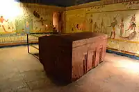 The Rosicrucian Egyptian Museum contains a composite replica of an ancient Egyptian rock-cut tomb, based on photos and sketches taken by Rosicrucian expeditions to tombs at Beni Hasan, in order to give the guests the experience of being in such an excavation. Below are photographs of the interior of the replica tomb, largely containing scenes from the Book of the Dead. The dark interior of the tomb replica is evident.