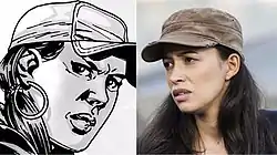 ![]() Rosita Espinosa, as she appears in the comic book series (left) and as portrayed by Christian Serratos in the television series (right). | |