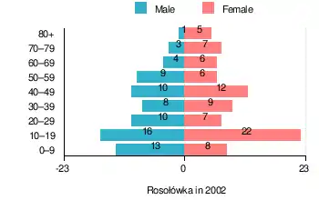 According to the 2002 Poland census, there were 156 people residing in Rosołówka village, of whom 47.4% were male and 52.6% were female. In the village, the population was spread out, with 34% under the age of 18, 34% from 18 to 44, 17.3% from 45 to 64, and 14.7% who were 65 years of age or older.[1]