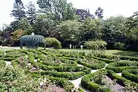 A circular driveway leads up to the house, set back a mere 40 feet (12 m) from the street to allow for outbuildings and the property's garden.[1] It includes elements of all three of its periods of private ownership: a formal boxwood rose parterre garden with tall calla lilies, boxwood specimen garden, cutting garden and Woodland Walk surrounding a 19th-century wooden latticework pergola.[5]