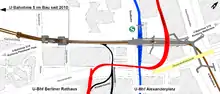 Rotes Rathaus is a subway station in Berlin's Mitte district. It is part of the extension of the U5 from Alexanderplatz to Brandenburger Tor, construction of which began with a groundbreaking ceremony in 2010.[1] The station and the line opened simultaneously on 4 December 2020.[2][3]