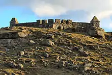 A tall stone built ruined square building. At the top are visible parts of the battlements. In the foreground a grassy slope with scattered stones leading up to the building. In the background white clouds with a small patch of blue sky.