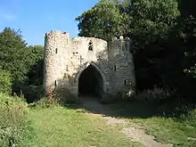 A folly built in 1811 by local master builder George Nettleton[23] to give the appearance of a castle gate. It originally had a wooden roof and an upper room, and was used as a summerhouse, a sewing room for the Nicholson girls, and for social functions such as dinners.[2]
