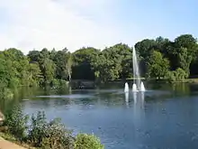 It was originally used for boating, and for a period there were trips around it in a steamboat called the Maid of Athens (which was sunk in the lake at the end of its useful life[2]). In 1900 this was replaced by an electric launch, the Mary Gordon, which operated until 1923.[28] A cafe was constructed above the boathouse. The lake is now used for fishing, but not boating. The lower part ends in a dam which included a sluice and waterfall from at least 1893.[29] By 1921, the waterfall fed a bathing pool at the bottom of the dam,[30] but both features have since been removed, and the overflow from the lake is now by a weir at the western end of the dam.[31]