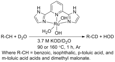 He has since extended his work on CH activation, to examine the use of basic solvents to facilitate the activation of strong bonds. The fundamental strategy in this case is to develop catalysts that operate by nucleophilic CH activation that, in contrast of electrophilic CH activation, generates negative charge on the carbon during CH cleavage. The expectation is that in this case the strongly basic solvent can both activate the catalyst as well as "protect" the alcohol product by deprotonation. This is done by the use of non-innocent ligands that participate in the reaction by protonation or deprotonation.[8][9] This allowed for the demonstration of the first example of aqueous base accelerated CH activation involving the use of a Ru(IPI)Cl3 pre-catalyst where IPI = 2,6-diimidizoylpyridine.[10] This strategy has led to demonstration of CH activation by a Ru(II)(IPI)(OH)n(H2O)m complex dissolved in aqueous KOH. As hoped, it was found that rates of CH activation are accelerated by increasing [KOH].