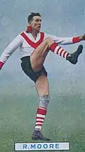 Late in the 1937 season, against Fitzroy at Lake Oval, Moore bagged a career-best nine goals despite the entire South Melbourne team managing just ten in the entire game; as of 2022, this remains a joint league record for the highest percentage of a team's goals in a single match (with a minimum qualifying total of least 8 goals); only Collingwood's Dick Lee has kicked that many goals in a game where only one other kicked a major score, sharing the record.[2] A leg injury restricted his appearances towards the end of his career, but Moore managed to finish as his club's top goal-kicker in 1938 with 34 goals. He represented the VFL on one occasion, in a game against the VFA.