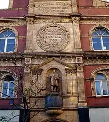 ![]() Detail of Central Stores in Powis Street, Woolwich, with the RACS motto and a statue of Alexander McLeod | |