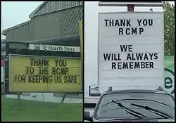 - ↑ Renato Gandia, RCMP pays tribute to wives who supported officers posted to smallest detachments Archived August 6, 2016, at the Wayback Machine, Calgary Sun (April 12, 2013).