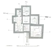 The underground chambers were accessible through a square vertical shaft that ended with a central vestibule. The four faces of the shaft were roughly aligned with the cardinal points and measured around 3.7 m (12 ft) each. The depth of the well, down to the vestibule floor, was 10.2 m (33 ft), including the 1 m (3.3 ft) meter deep soil layer. On the eastern wall of the well, at a depth of 6 meters, three rows of well-cut ashlar blocks were laid to prevent the collapse of the shaft. The vestibule opened on all four sides, at varying depths, into four different funerary vaults, to which Hamdi Bey assigned Roman numbers as they were being cleared: Vault I to the East, Vault II to the West, Vault IV to the South, Vault V to the North (see attached diagram).[50]