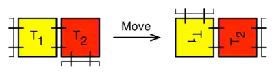 The basic operation (move) consists of transferring a hinge between two tiles T1 and T2, from one pair of edges (E11 of T1 and E21 on T2) to another pair E12 and E22. Here, edges E11 and E12 are adjacent on tile T1, and so are edges E21 and E22 on tile T2 but in opposite order. See the figure below for an example, where E11 is the East edge of the yellow tile, E21 is the West edge of the red tile, and both E21 and E22 are the North edges.