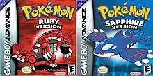 ![]() North American box art for Pokémon Ruby and Pokémon Sapphire depicting the legendary Pokémon Groudon and Kyogre respectively | |