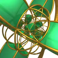 ![]() Perspective projection into 3D centered on a truncated cuboctahedron. The nearest great rhombicuboctahedral cell to the 4D viewpoint is shown in red, with the six surrounding great rhombicuboctahedra in yellow. Twelve of the hexagonal prisms sharing a square face with the nearest cell and hexagonal faces with the yellow cells are shown in blue. The remaining cells are shown in green. Cells lying on the far side of the polytope from the 4D viewpoint have been culled for clarity. |
