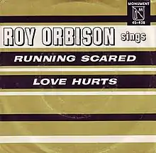 "Running Scared" is a song written by Roy Orbison and Joe Melson and sung by Orbison. An operatic rock ballad,[3] the recording of the song was overseen by audio engineer Bill Porter and released as a 45 rpm single by Monument Records in March 1961 and went to number one on the Billboard Hot 100 chart. "Running Scared" also reached No.9 in the UK Singles Chart. It sold over one million copies in the US alone.[4] The song was included on Orbison's 1962 album Crying as the final track on the album.