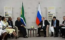 Putin's 2006 visit to South Africa is noted as a particular turning point in the strengthening of bilateral relations.[1] During the presidency of Jacob Zuma Russian-South Africa ties warmed significantly as the Putin administration sought to move a strategic country away from the West and gain a foothold in Africa; for its part South Africa sought to distance itself from Western actions in Libya during the fall of Muammar Gaddafi.[9]